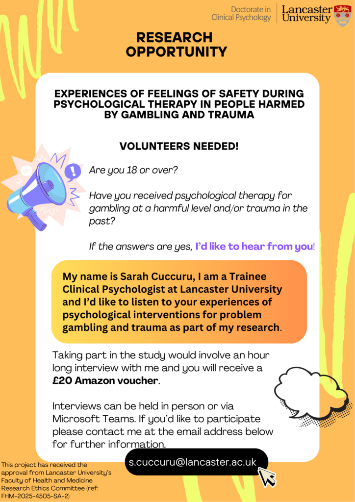 Taking part in the study involves participants being interviewed for 60-90 minutes about their experiences. It can be a really great way for participants to have a therapeutic experience of talking to a trained mental health professional about their experiences and to also feel that they are contributing to research that can help to inform how NHS gambling services are provided to significant others in the future. There is also a £10 Amazon voucher for taking part.